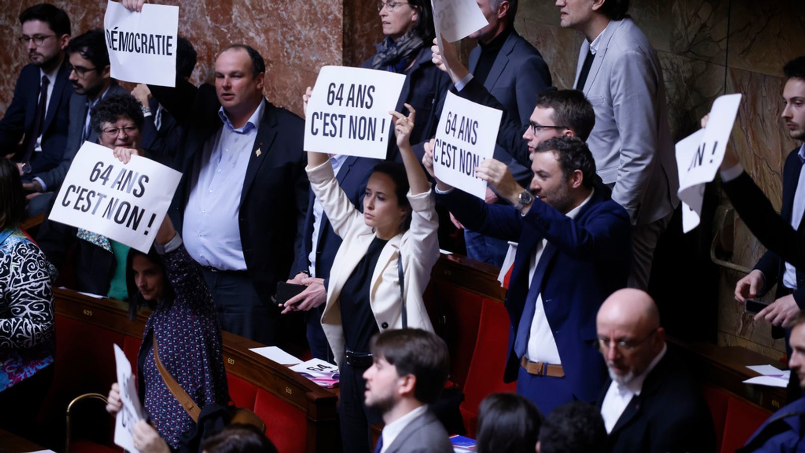 As the prime minister, Elisabeth Borne, tried to formally announce the special procedure in the assembly, some left-wing politicians held up placards reading "no to 64 years", while far-right leader Marine Le Pen called for her to resign.